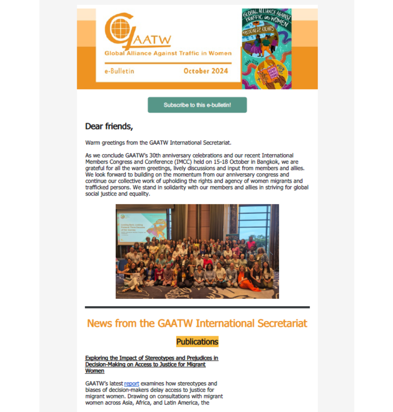 As we step into the middle of the year, we present to you the second issue of our e- bulletin. The first quarter of 2024 has been a busy one. We have met with many of you to plan GAATW’s 30th anniversary and the International Members Congress and Conference (IMCC) which will be held in Bangkok on 15-18 October 2024.